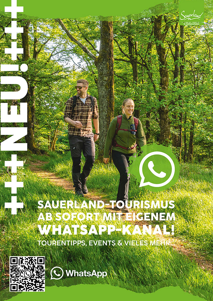 Ab sofort bietet der Sauerland-Tourismus allen Interessierten einen neuen Service: Über einen eigenen WhatsApp-Kanal erhalten Nutzerinnen und Nutzer wöchentlich aktuelle Tipps für Veranstaltungen und Freizeitaktivitäten – schnell, zuverlässig und direkt in ihrem persönlichen Nachrichten-Feed.